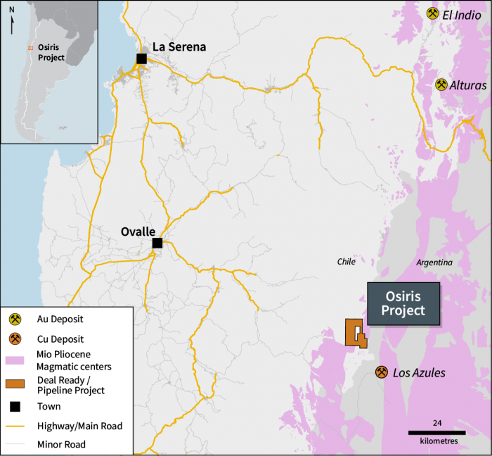 A nivel regional, Osiris se ubica dentro de la extensión sur del cinturón epitermal de alta sulfuración de El Indio de la Edad del Mioceno y la extensión norte del cinturón de pórfidos del Mioceno Sur, las cuales son regiones bien dotadas en Chile y Argentina. La mineralización en Osiris parece estar controlada por el mismo lineamiento prominente hacia el noroeste, una característica regional clave que también controló el emplazamiento del Mioceno tardío Los Azules, un proyecto de pórfido de Cu en etapa avanzada (McEwen Mining Inc – Recursos indicados: 10.2 B lbs en 0.48% Cu y 1.7 Moz a 0.06 g / t Au 1 ) ubicado a unos 17 km al sureste.