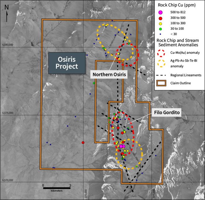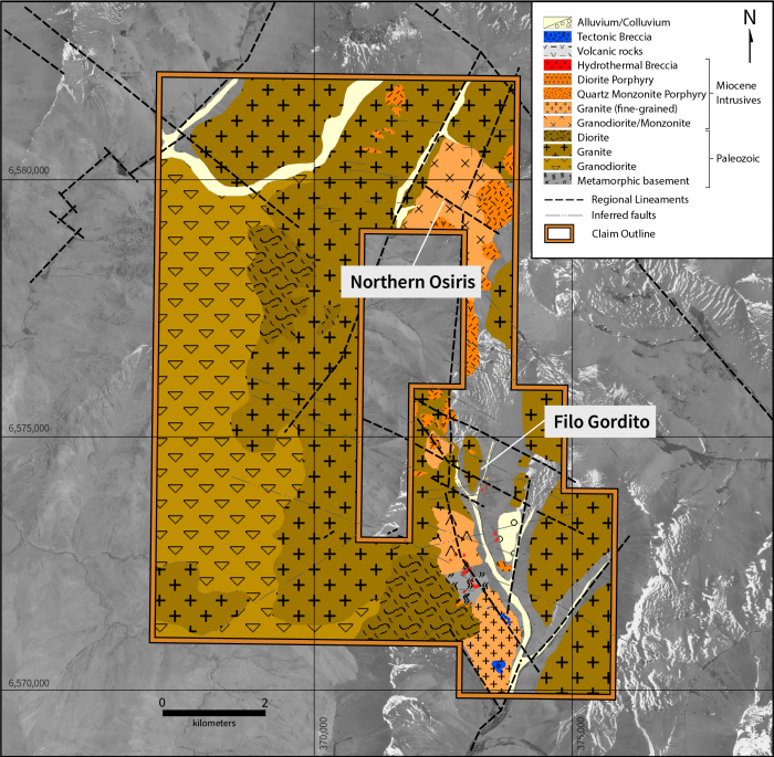 La geoquímica de fragmentos de roca de Cu-Mo- (Au) (Figura 3) y el análisis espectral de alteración han definido dos objetivos, en Filo Gordito y Northern Osiris, con la mineralización de Cu que se produce como óxidos supergénicos desarrollados a partir de calcopirita primaria. Periféricos a estos dos objetivos, los estudios geoquímicos también han definido anomalías polimetálicas epitermales de Ag-As-Sb-Te-Bi-Pb ± Au. Además, en la parte sureste del objetivo Filo Gordito, una gran huella de alteración fílica de 3 x 2 km afecta las unidades porfídicas y las brechas intrusivas. La brecha intrusiva tiene una fuerte alteración de cuarzo-sericita, que es cortada por venas de sericita de cuarzo (venas de pórfido estilo D). Esta alteración fílica, que muestra localmente una sobreimpresión de alunita,