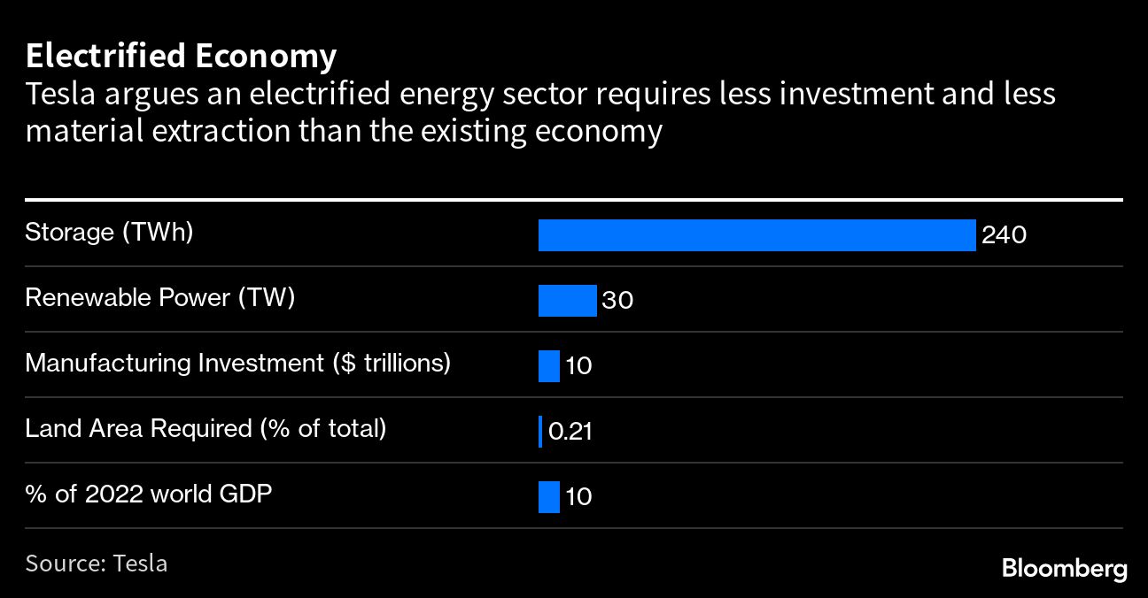 El sistema de energía global previsto por Musk requiere alrededor de 30.000 gigavatios de capacidad de energía renovable y 240.000 gigavatios-hora de baterías de almacenamiento. Esas cifras se comparan con la capacidad de energías renovables de 3214 gigavatios en 2021 y un sector de almacenamiento de energía estacionario que se prevé que tenga 1432 gigavatios hora de capacidad para fines de 2030, según BloombergNEF. Eso representaría una gran ayuda para las empresas de tecnología limpia como Tesla.