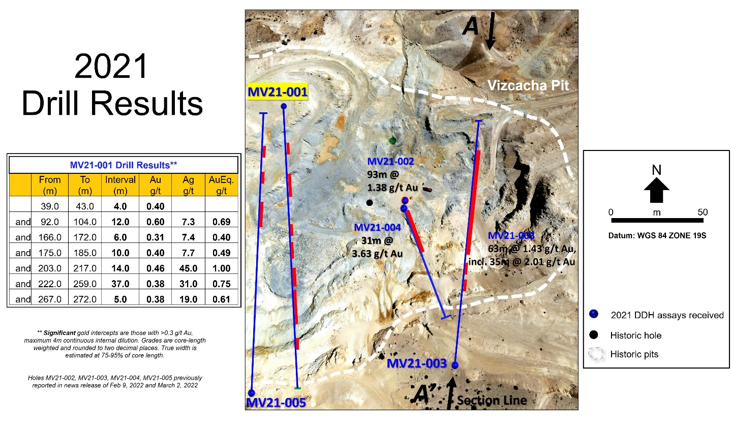 Figura 3: Mapa en planta del tajo Vizcacha con la ubicación de intercepciones significativas de oro en el pozo de perforación MV21-001. Los resultados de los pozos MV21-002, 003, 004 y 005 se informaron previamente el 9 de febrero de 2022 y el 2 de marzo de 2022.