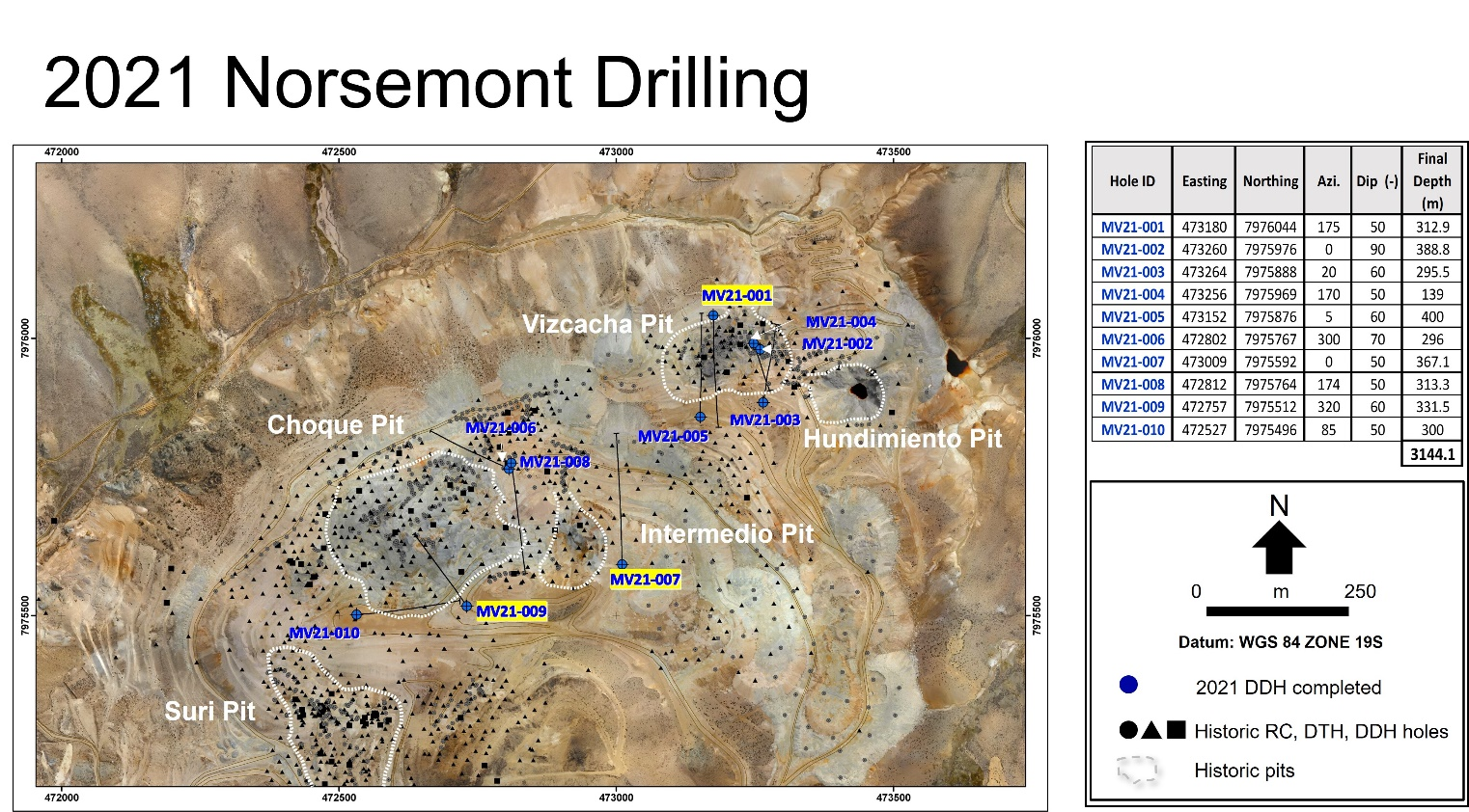 Marc Levy, director ejecutivo de Norsemont, comenta: «Este emocionante pozo de perforación, MV21-009 debajo de Choque Pit, es potencialmente transformador para la empresa. El intervalo de 170 m con ley de 1,57 g/t AuEq permanece abierto a lo largo del rumbo y en profundidad. El hecho de que las leyes de metales preciosos aumento a 1,92 g/t AuEq en los 100 m inferiores de este pozo junto con la presencia de mineralización de cobre respalda nuestra tesis de mineralización potencial de pórfido Au-Cu debajo de este pozo. «Vizcacha se ve en profundidad. En ambos lugares hemos demostrado que la mineralización significativa se extiende más allá de la perforación histórica, a profundidades de al menos 300 m verticalmente debajo de la superficie».