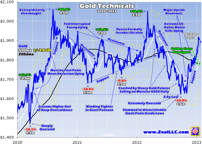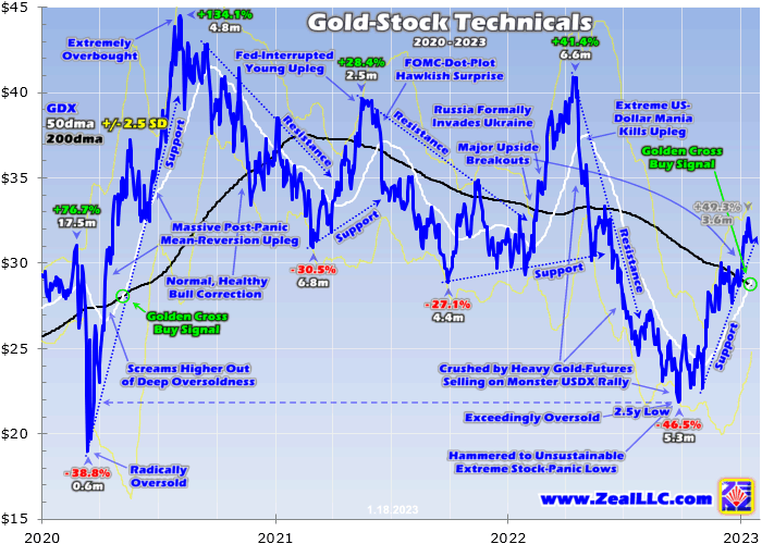 Los cruces dorados ocurren cuando esos 50dmas más rápidos cruzan por encima de los 200dmas más lentos desde abajo. El último ejemplar acaba de dispararse en oro el pasado viernes 13 de enero. Luego, un día de negociación más tarde, el martes 17, la propia cruz dorada de las acciones de oro brilló en su ETF de referencia líder GDX VanEck Gold Miners. Estas fuertes señales técnicas de compra son grandes negocios, aumentando la confianza de los comerciantes en estos jóvenes uplegs.