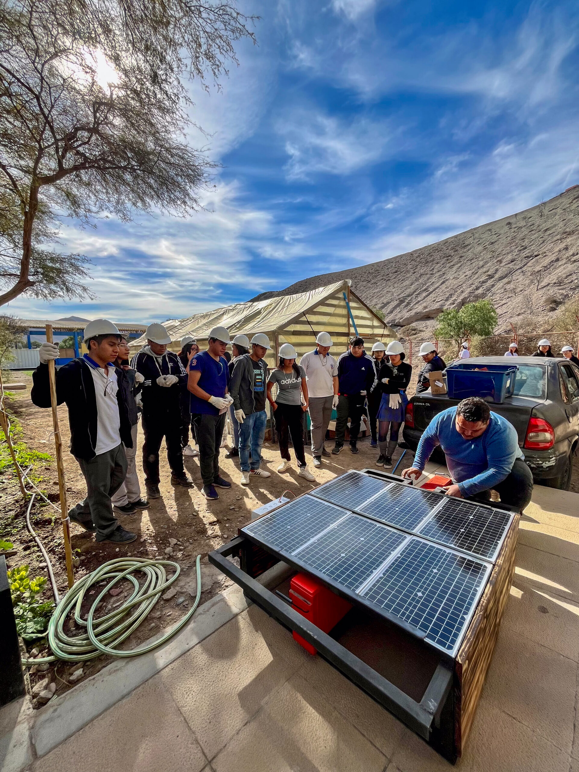 Finalmente, el tercer curso buscó rescatar el uso de la energía renovable para la pequeña agricultura, mediante la capacitación e instalación de un sistema de riego tecnificado y bombeo a través de paneles solares. Este taller fue dirigido a los y las alumnas de 3° y 4° medio de la Escuela Concentración Fronteriza de Los Loros, quienes actualmente se encuentran construyendo un huerto para la especialidad de técnico agrícola.