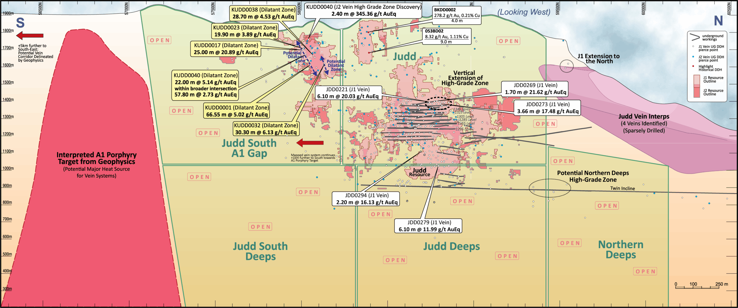 En Judd-Judd South (incluyendo Judd Deeps), todos los pozos de perforación interceptaron mineralización, con 12 intersecciones que excedieron los 10 g/t AuEq y 21 intersecciones que excedieron los 5 g/t AuEq.