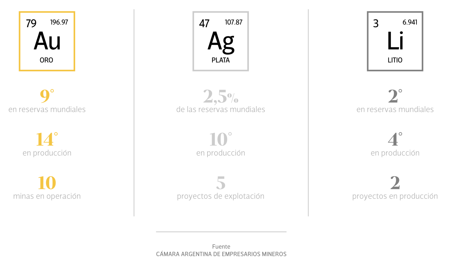 3) Plata: Argentina es un productor histórico y en la actualidad se ubica en el décimo lugar entre los productores a nivel mundial, con muy buenas perspectivas en relación a cinco proyectos que se encuentran en etapa de exploración avanzada o factibilidad. como Joaquín, Virginia, Lejano (Santa Cruz), Navidad (Chubut), El Quevar (Salta). Y en oro el país tiene 2 de las 25 mayores minas del mundo. Veladero en San Juan y Cerro Negro en Santa Cruz. al igual que Lindero, Cerro Vanguardia, Gualcamayo, Farallón Negro y Don Nicolás.