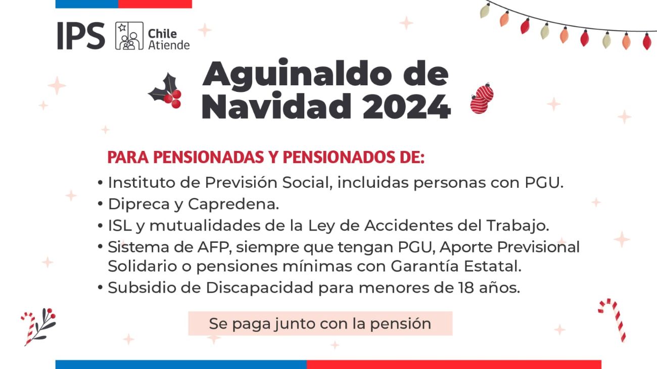 Tienen derecho al Aguinaldo de Navidad los pensionados y pensionadas del Instituto de Previsión Social (IPS), incluidas las personas con PGU; de las Cajas de Previsión de Dipreca y Capredena; del Instituto de Seguridad Laboral (ISL); de las Mutualidades de Empleadores de la Ley N° 16.744 de Accidentes del Trabajo, que tengan alguna de estas calidades al 30 de noviembre del año 2024. El Aguinaldo también beneficia a quienes reciben Subsidio por Discapacidad Mental, Física o Sensorial Severa (Ley N° 21.419).