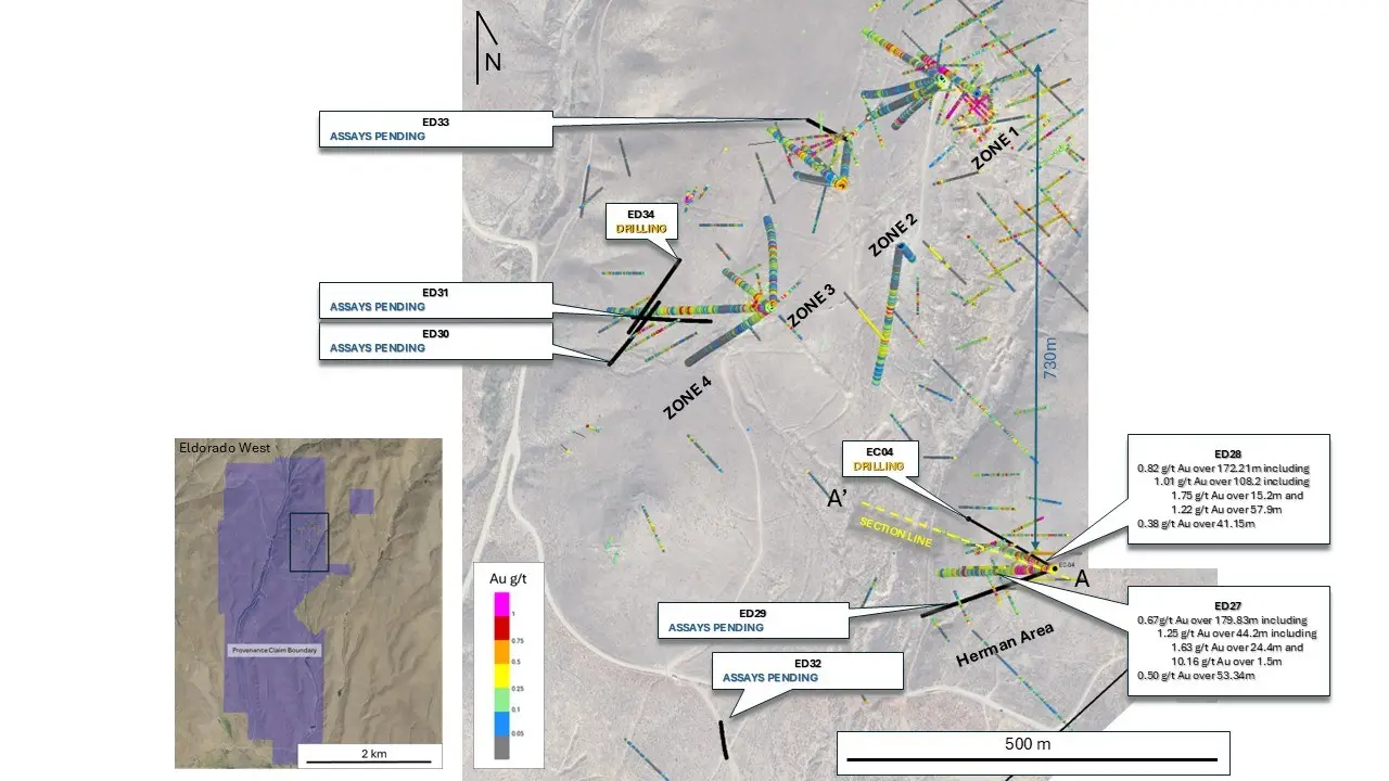 Los pozos de perforación ED27 y ED28, los primeros pozos completados en el área Herman recientemente permitida, están ubicados a 730 metros al sur del pozo E26 recientemente reportado (Figura 1-2). Tanto ED27 como ED28 interceptaron intervalos amplios y generalizados de fuerte mineralización de oro desde la superficie e identificaron una nueva zona de contacto mineralizada entre las rocas sedimentarias anfitrionas y la diorita. La zona de contacto diorita-metasedimentaria recientemente reconocida es poco profunda, extensa lateralmente y se proyecta al sur, oeste y noroeste de ED27 y ED28 (Figura 1-2). Esta geometría crea un nuevo objetivo de exploración amplio que tiene el potencial de albergar mineralización de oro de alto grado y tonelaje a granel en una gran área de las partes sur y oeste de la propiedad, previamente inexploradas. Además, este entorno estructural se ha identificado con una fuerte mineralización en el proyecto Eldorado East recién adquirido y respalda el modelo geológico de que la mineralización en Eldorado abarca tanto Eldorado East como West.