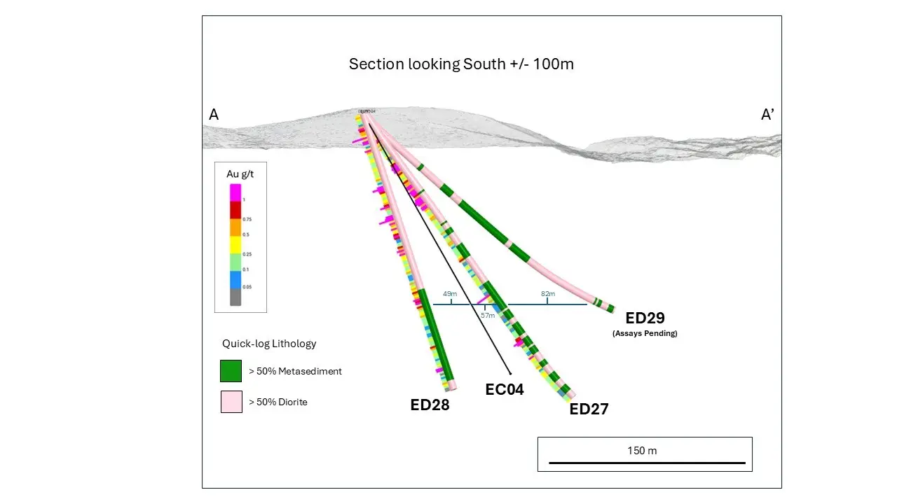 La perforación RC continúa e incluye ED29 (ensayos pendientes), perforado hacia el suroeste desde ED27. Además, la plataforma central ha llegado al sitio y la perforación ha comenzado con EC04 ubicado en el área de Herman (Figura 1). Los pozos de perforación de núcleo se enfocarán en la expansión de la mineralización conocida y proporcionarán información crítica sobre los controles estructurales y geológicos del sistema.