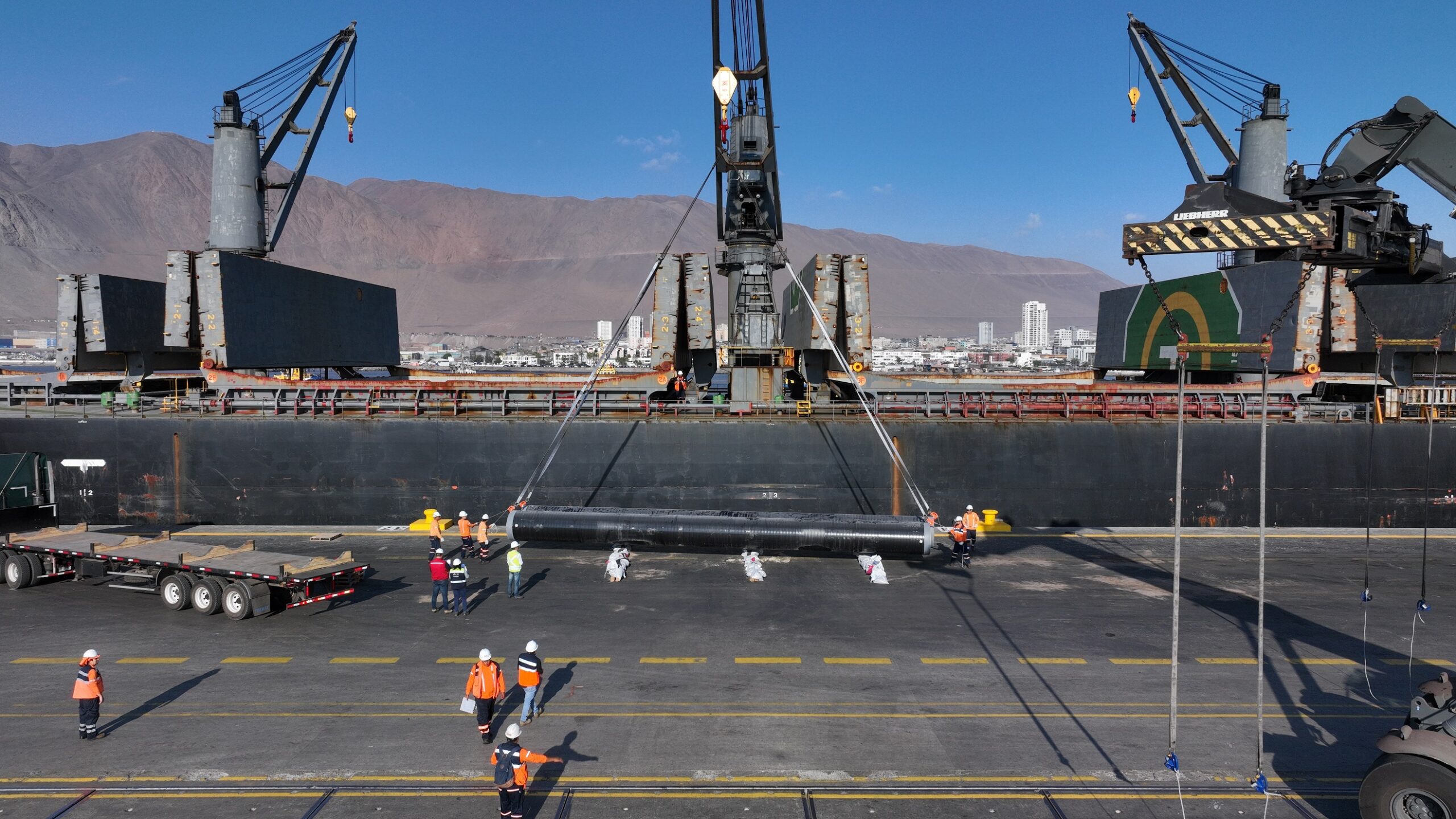 - El proceso finalizó con la llegada de 11 mil tuberías -equivalente a 95 mil toneladas- las que fueron ingresadas a través del puerto de Iquique en una gestión coordinada con Iquique Terminal Internacional y transportistas locales.