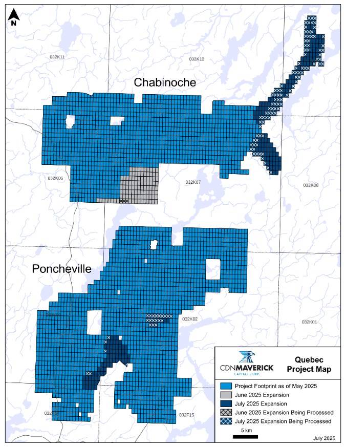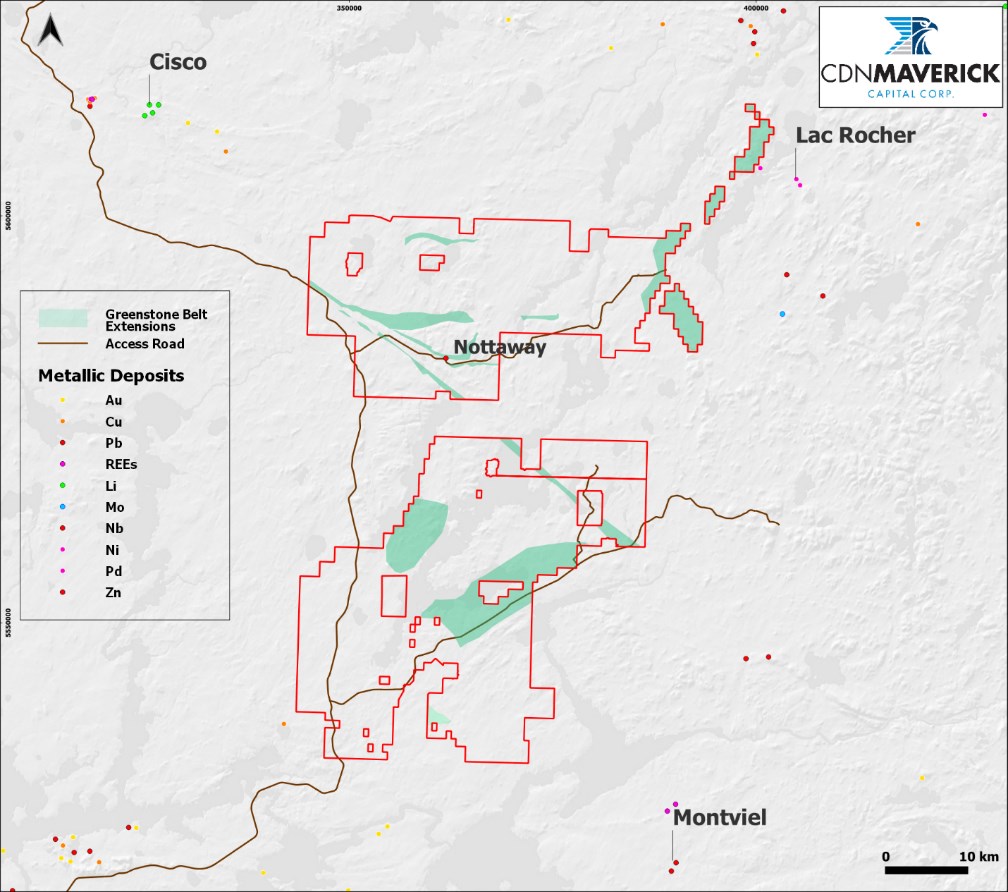 CDN Maverick Capital Corp. (CSE: CDN) (OTCQB: AXVEF) (FSE: 338B) («Maverick» o la «Compañía») se complace en anunciar la expansión de sus paquetes de tierras en James Bay, Quebec con la adición de 170 nuevos reclamos minerales, que comprenden 98 reclamos en Chabinoche y 72 en Poncheville, con un total de 9,222 hectáreas (Figura 1). Incluyendo las reclamaciones de Nottaway, Maverick ahora ha asegurado más de 14,782 hectáreas (~ 147.8 km²) a través del replanteo. Estos reclamos se encuentran principalmente a lo largo de extensiones interpretadas del sur del Cinturón de Piedra Verde de Frotet-Evans («FEGB»), un prolífico terreno arcaico que alberga importantes depósitos como Troilus (Au-Cu), Moblan (Li) y el reciente descubrimiento de pegmatita Cisco LCT de Q2 Metals.