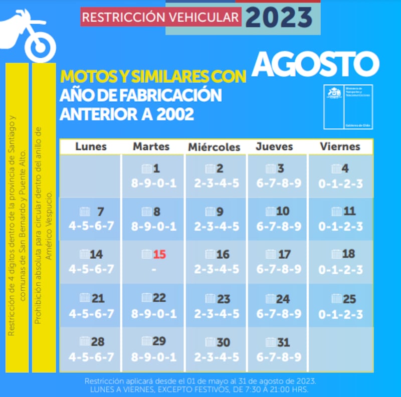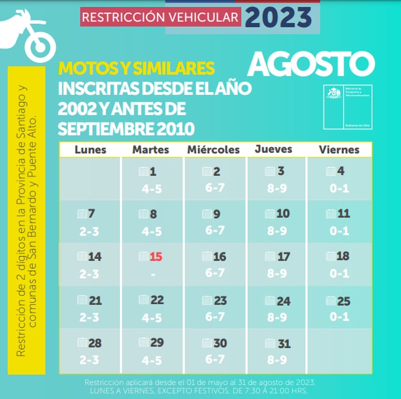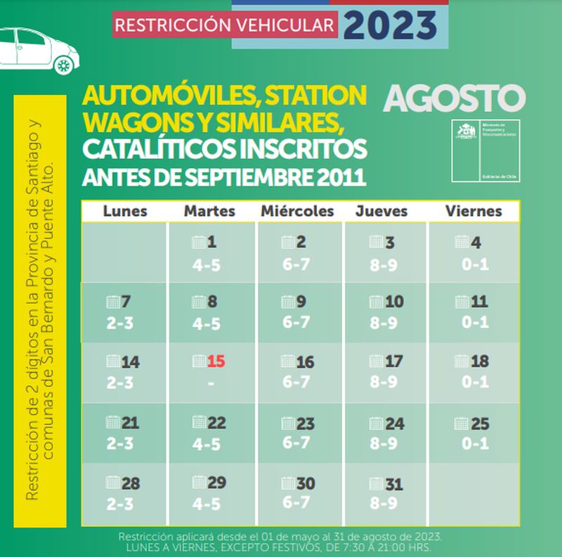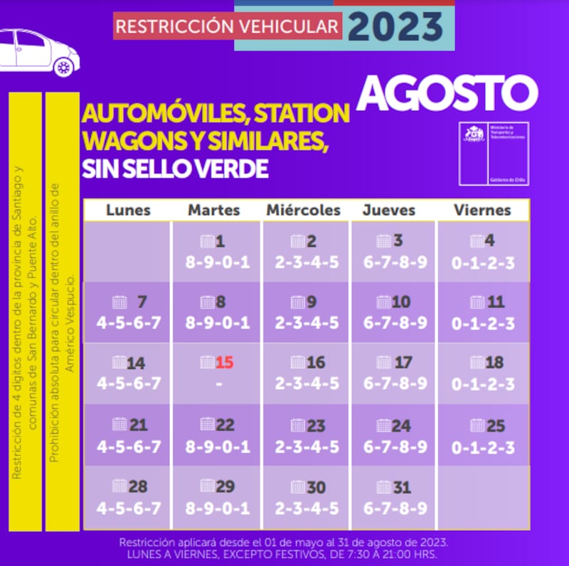 Revisa el calendario de agosto de la restricción vehicular, elaborado desde el Ministerio de Transportes y Telecomunicaciones.