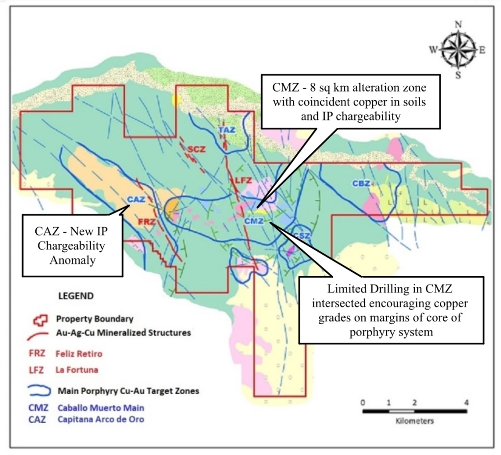 En 2021, San Lorenzo inició una encuesta IP que amplió las líneas de encuesta existentes y cubrió partes no probadas de la Propiedad. El estudio logró expandir la fuerte anomalía de cargabilidad anular en CMZ a aproximadamente seis kilómetros cuadrados y delineó una nueva anomalía de cargabilidad en la zona CAZ. La zona CMZ (Figura 1) tiene aproximadamente ocho kilómetros cuadrados de alteración intensa que coincide con un alto contenido de cobre en los suelos y la fuerte anomalía de carga de polarización inducida («IP»). La perforación en 2018 en la zona CMZ interceptó los bordes de un sistema de pórfido de cobre y oro con leyes alentadoras de: