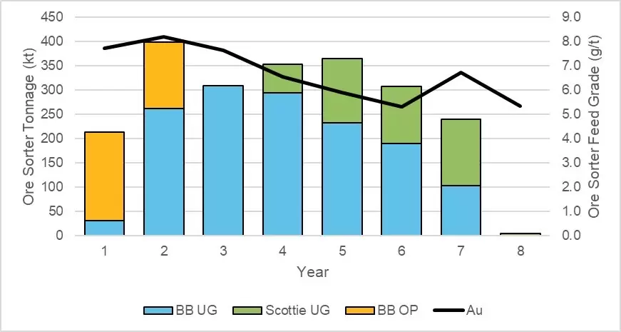 Se planea que el proyecto DSO comience con la minería a cielo abierto en la Zona de Contacto de Blueberry, seguida de cerca por la minería subterránea en la Zona de Contacto de Blueberry y, posteriormente, en la Mina de Oro Scottie (consulte la Figura 1 para ver el programa de producción). Luego, el material extraído se triturará y clasificará utilizando un sistema de clasificación de mineral basado en XRF. El producto mejorado se transportará a las instalaciones de envío a granel de Stewart ubicadas a 40 km por una carretera existente para ser enviado al extranjero. Luego, el material se vendería a Ocean Partners según los términos negociados en el acuerdo de compra existente (ver NR del 7 de julio de 2025).