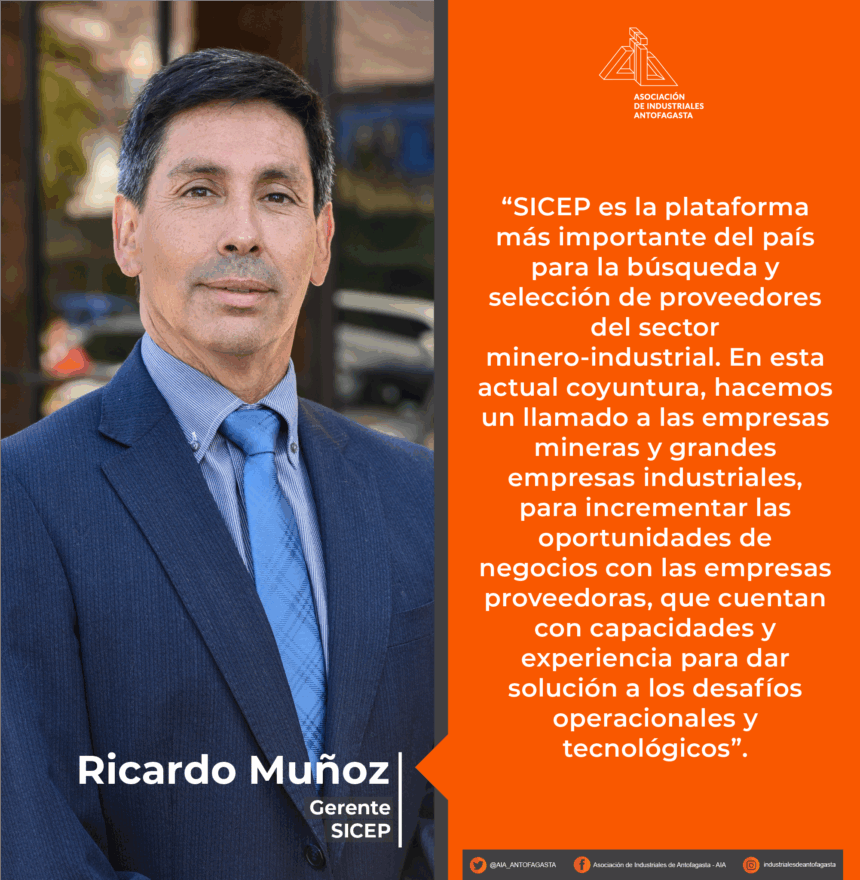 Un llamado a la industria de la gran minería hizo el gerente del Sistema de Certificación de Empresas Proveedoras (SICEP), Ricardo Muñoz, en orden a incrementar las oportunidades para las empresas proveedoras en medio del crítico panorama económico producto de la emergencia sanitaria que afecta al país y al mundo. La plataforma de la Asociación de Industriales de Antofagasta (AIA) se encuentra en pleno proceso de actualización de antecedentes de una red que entrega servicios a 25 grandes compañías usuarias.