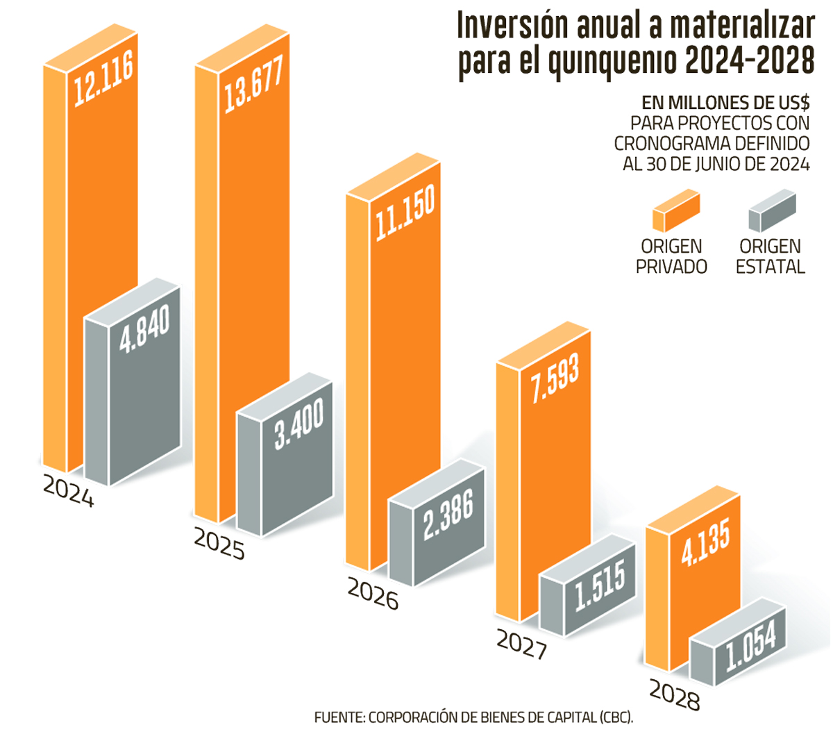 En su actualización al 30 de junio, el reporte contempla un stock total de iniciativas a materializar en 2024-2028 por US$ 61.867 millones, con 837 proyectos, de los cuales un 79% corresponde a financiamiento privado y un 21% a estatal.
