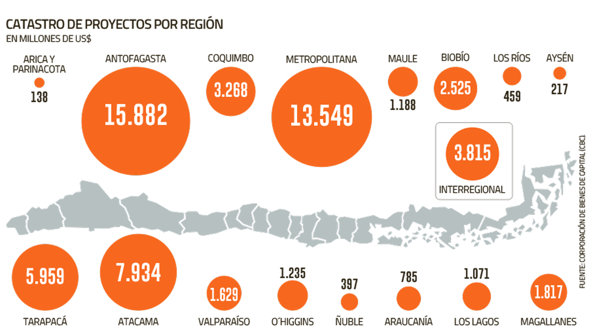 La mirada por regiones indica que Antofagasta, Atacama, Tarapacá y la Metropolitana agrupan un 70% de los montos a invertir en los próximos cinco años.