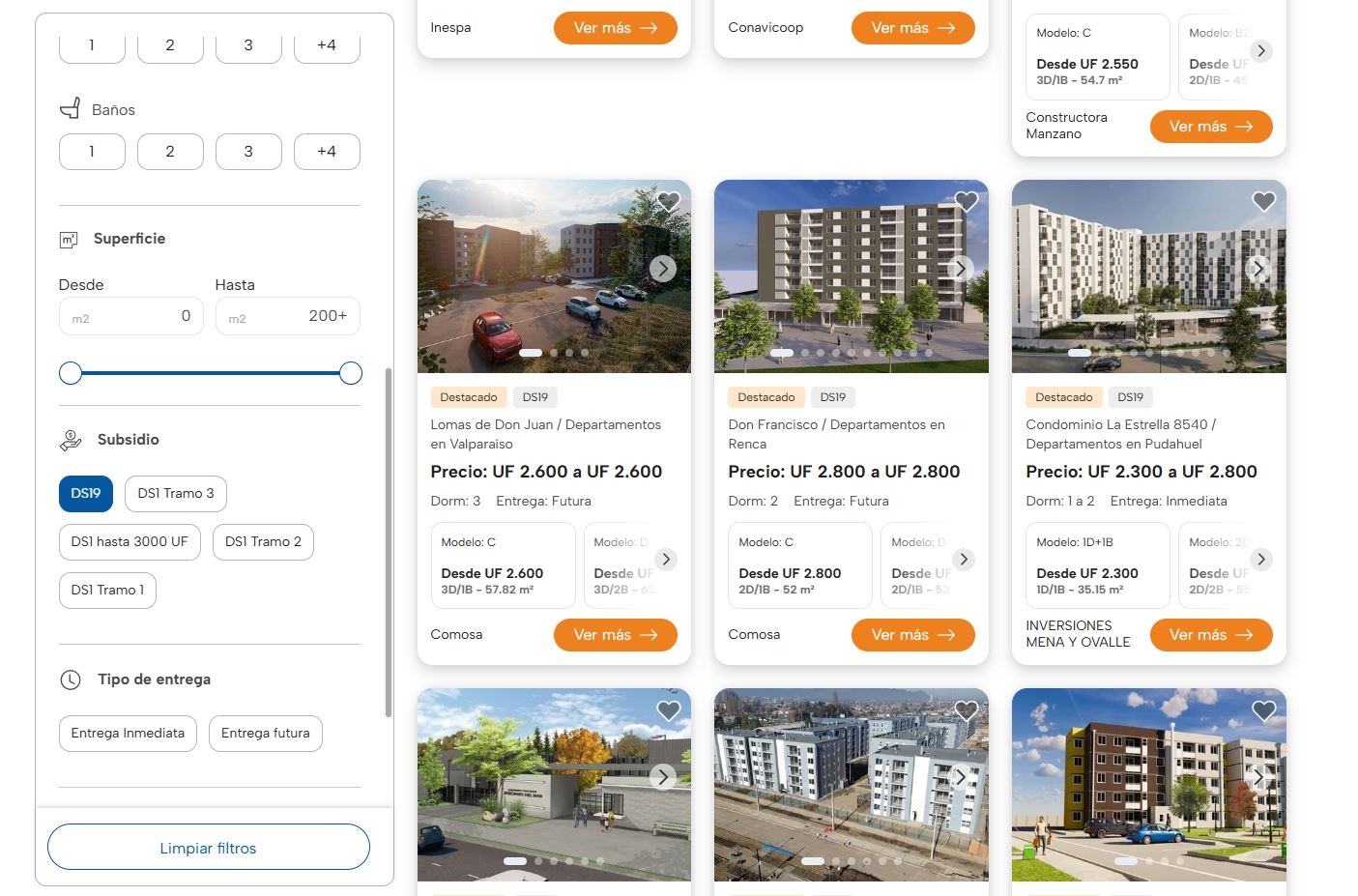 Sin embargo, el paso más importante es seleccionar, en el apartado de «Subsidio», la opción DS19. Cada vez que vayas agregando criterios de búsqueda, la oferta de viviendas disponibles se irá ajustando automáticamente