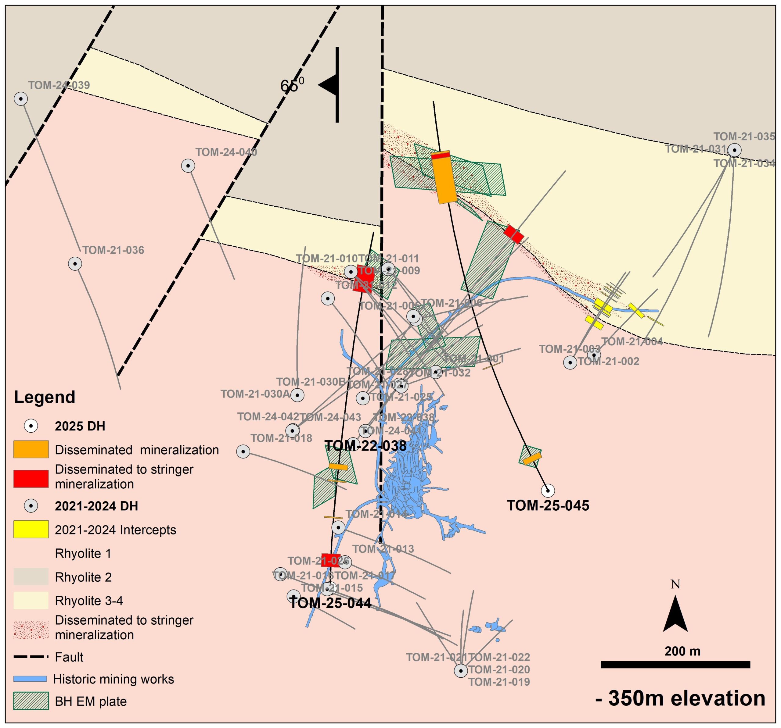 - Pozo de perforación TOM25-044: intersectó múltiples zonas de rocas de pared de pie fuertemente alteradas y mineralizadas con sulfuros, que incluyen: