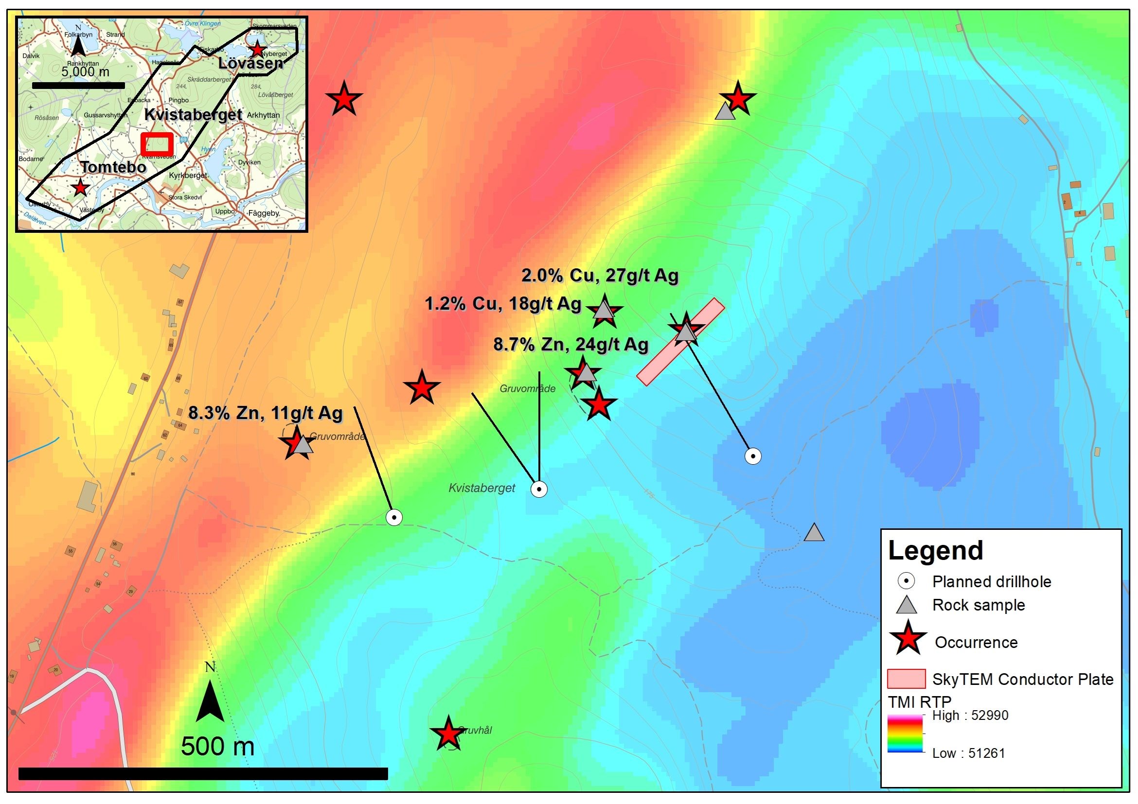 El equipo de perforación se ha trasladado ahora a Kvistaberget, que es un objetivo de exploración situado a 5 km al noreste de la histórica mina Tomtebo. Se planea un total de 700 a 1.000 m de perforación en dos o tres pozos en Kvistaberget para probar una anomalía conductora geofísica SkyTEM asociada con ocurrencias minerales históricas donde el muestreo de roca de agarre arrojó leyes fuertes de cobre y zinc (Figura 2). Sobre la base de los resultados de la geoquímica de roca entera, el área objetivo de Kvistaberget se encuentra a lo largo del rumbo del horizonte de sulfuro volcánico masivo (VMS) (riolita 1 y riolita 3-4 contacto) en la histórica mina Tomtebo. Kvistaberget nunca ha sido probado previamente en perforaciones.