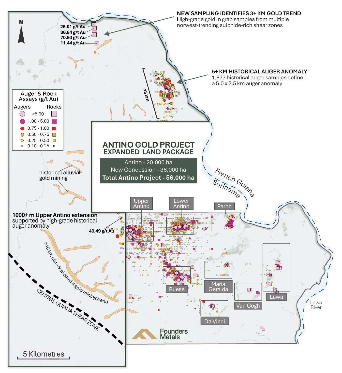 Founders Metals Inc. (TSXV: FDR) (OTCQX: FDMIF) (FSE: 9DL0) («Fundadores» o la «Compañía») se complace en anunciar la firma de una Carta de Intención vinculante (la «LOI») para adquirir una participación del 100% en una concesión de exploración de 36,000 hectáreas (ha) inmediatamente adyacente al Proyecto de Oro Antino («Antino») de la Compañía en el sureste de Surinam (Figura 1). La adquisición casi triplica la posición de tierra de Founders a aproximadamente 56,000 ha (560 km2) de terreno altamente prospectivo dentro del cinturón de piedra verde del Escudo Guayanés (Figura 2).