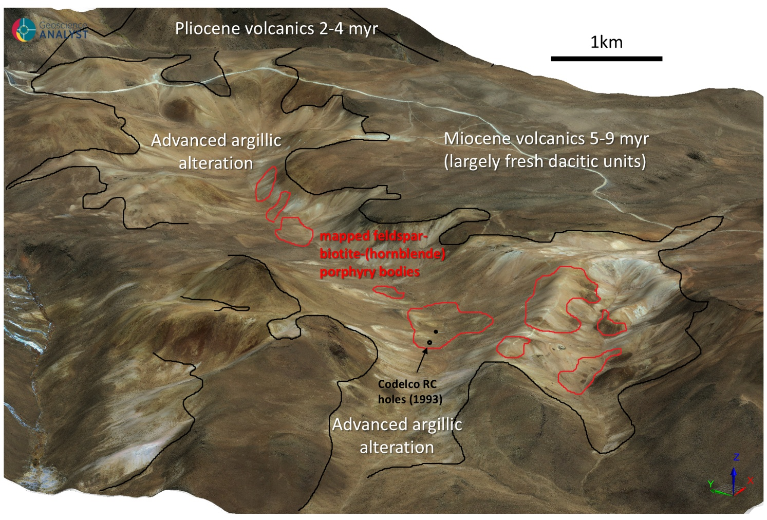 Figura 2. Vista oblicua al NE del sistema de alteración argílica avanzado inciso en Jiguata (rocas pálidas) que alberga unidades porfiríticas mapeadas (en rojo). Una delgada capa de rocas volcánicas del Mioceno (unidad subhorizontal oscura) cubre esta zona de alteración. Los dos barrenos históricos RC de Codelco (250 m y 300 m de profundidad) se muestran en el fondo sur del valle.