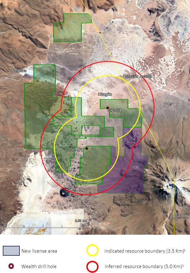 Nota 1: Estos son los límites de estimación de recursos que fueron definidos en el Informe Técnico del 13 de enero de 2023 “Recursos estimados de Litio Proyecto Ollagüe” para los pozos OC-01 y OC-04, donde se encontraba el límite de 3.5 km más cercano al pozo. Se utilizó para estimar un recurso indicado, mientras que el área entre el límite de 3,5 km y un segundo límite de 5 km se utilizó como extensión del área para estimar un recurso inferido.