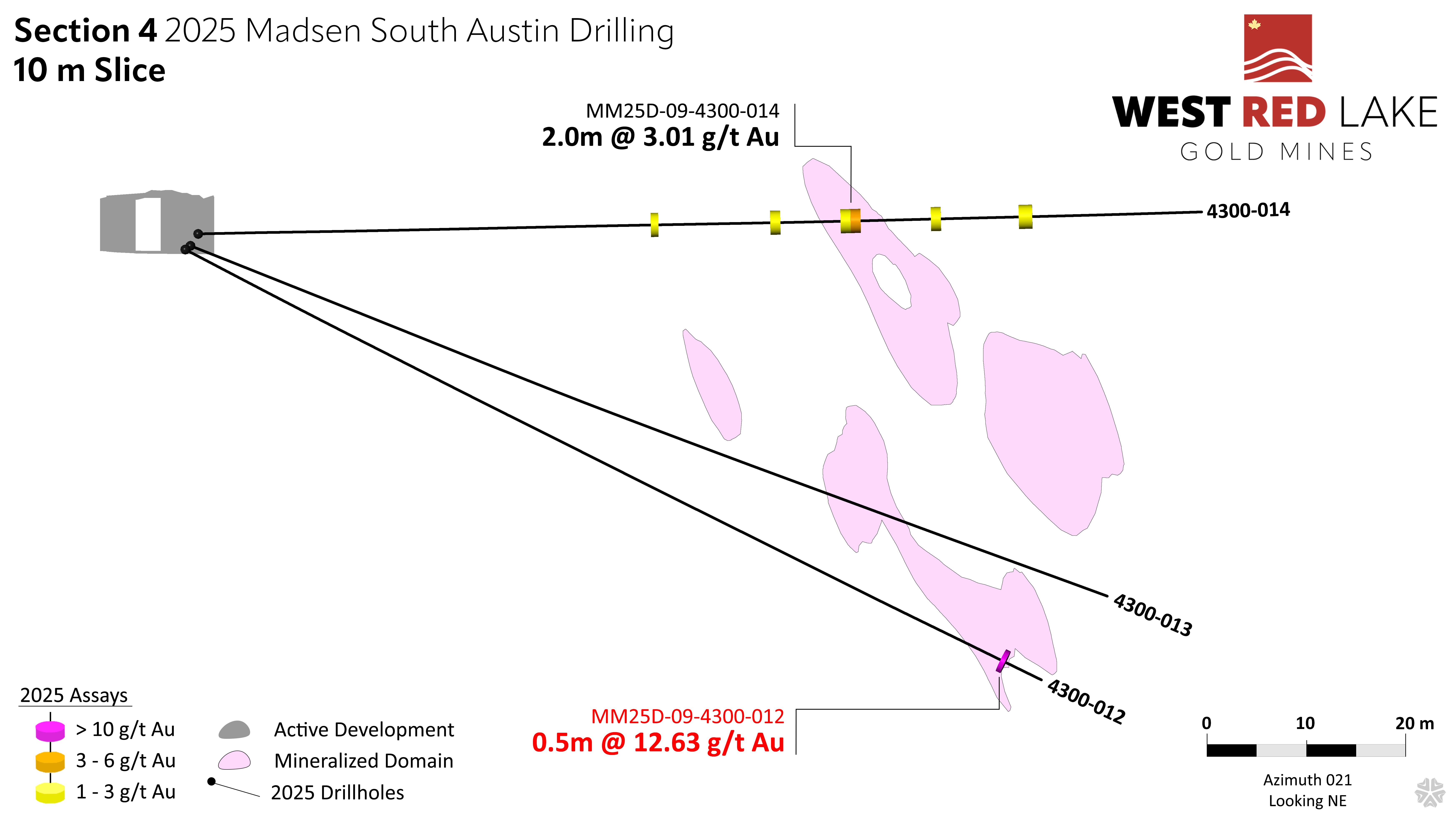 Se accede a través del Portal Oeste de la Mina Madsen, la Zona Sur de Austin se encuentra al sur en la pared colgante de la Zona principal de Austin. Al igual que los otros dominios mineralizados que comprenden la mina Madsen, la estructura del sur de Austin está alojada dentro de amplios corredores de alteración y deformación plana a escala kilométrica que se han reactivado repetidamente durante la mineralización de oro y la posterior deformación y metamorfismo.