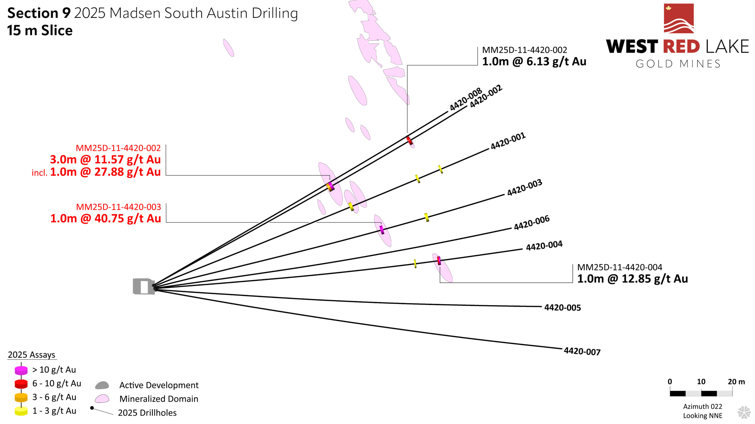 El programa actual de perforación subterránea en la mina Madsen se centra en una mayor definición del inventario minero a corto plazo, así como en el crecimiento del recurso mineral actual. La perforación se ha centrado en las partes más continuas y de mayor ley de las zonas de Austin, South Austin, North Austin y McVeigh. Esta seguirá siendo la estrategia hasta 2025.