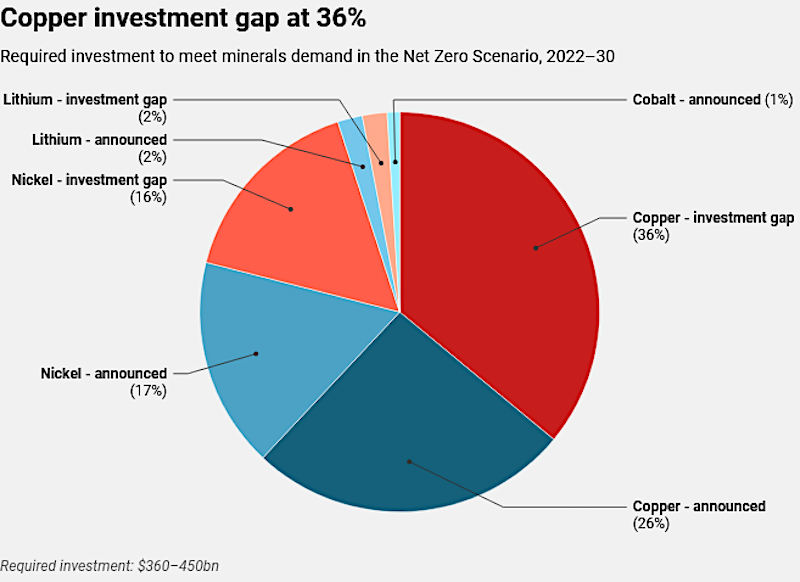 Si se tienen en cuenta otros metales y minerales, incluidos el litio, el níquel y el cobalto, la inversión requerida en materias primas críticas a nivel mundial se estima entre $ 360 y $ 450 mil millones, dijo la Agencia Internacional de Energía (AIE) en un informe de mayo .